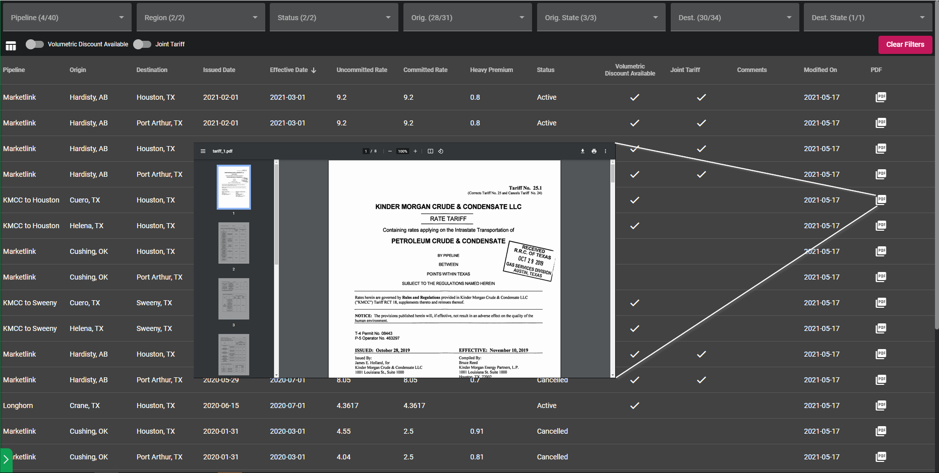 - Access to our tariff database, which includes data and tariff PDFs accessible via our oil portal and RESTful API along with full historical crude pipeline tariff data starting from October 2018