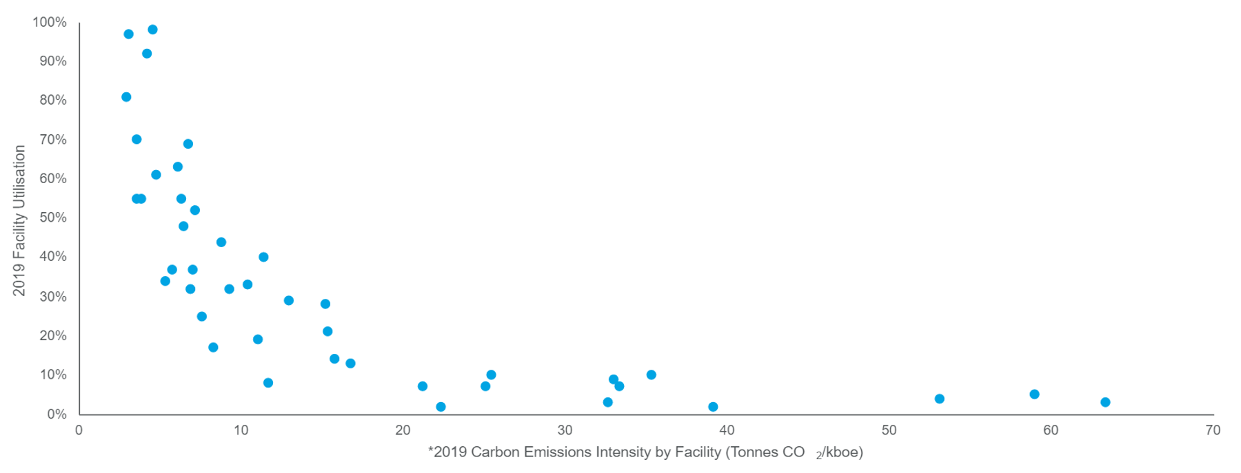 This comes from a note by Mfon Usoro, Wood Mackenzie’s senior analyst for the US Gulf of Mexico Upstream. It shows a plot of installations in the gulf, highlighting the relationship between utilisation rates and the carbon intensity of production. Utilisation rates are on the y-axis, and emissions intensity is on the x-axis. The inverse relationship is clear: facilities continue to run regardless of the volumes of oil and gas hydrocarbons processed, which means their emissions are mostly fixed. Lower output means a higher emissions intensity. As emissions performance increasingly becomes an important issue for oil and gas producers, these data provide an additional reason to improve utilisation rates. Assets in the US Gulf of Mexico already have some of the lowest carbon emissions intensities in the industry worldwide. However, Usoro comments: “There is always room for improvement, and operators recognise the opportunity.”