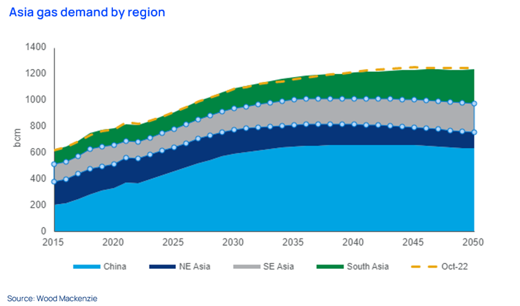 This chart was used in a presentation given by Wood Mackenzie analysts in Vancouver last weekend. It shows our base case forecast for natural gas demand in Asia, and makes clear that we are still expecting robust growth, at least into the 2030s. (The red dotted line shows our previous projection, from October 2022. As you can see, we have not changed our view much since then.) We expect that rising living standards, expanding urban populations, economic growth, electrification and coal-to-gas switching for power generation will all drive Asia’s demand for gas in the long term. However, there will be substantial differences between different Asian markets. In our forecast, Northeast Asia demand remains relatively flat and enters decline in the long term. China is the largest contributor to Asian demand growth to 2030, but Southeast Asia and South Asia take over as key growth areas in the longer term.