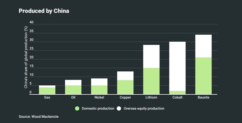 This comes from a fascinating new report on China’s push for energy independence, from Wood Mackenzie’s Huang Miaoru, Zhou Yanting and Gavin Thompson. Over the past decade, China has gone to enormous lengths to increase ownership of and access to battery raw materials, from cobalt resources in the Democratic Republic of the Congo to lithium reserves in Chile and Indonesian nickel mines. The result is that China now controls significant shares of global supplies for some critical metals, and has positions there that are much stronger than for either oil or gas production.