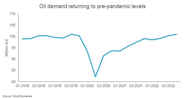 As activity picks up, so does demand for energy. Oil demand in the current quarter has been running roughly in line with the first quarter of 2020, according to Wood Mackenzie’s Macro Oils service, but for the rest of 2021 it is expected to be well above last year’s levels. By the fourth quarter of next year, oil demand is expected to hit a new record high, above the previous peak in the third quarter of 2019.