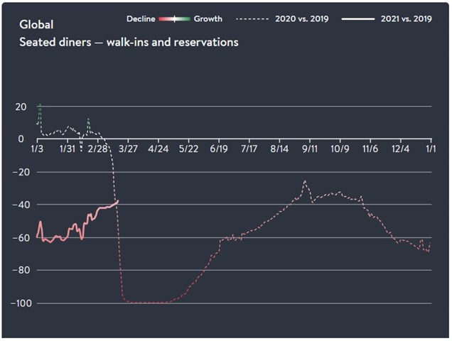 OpenTable, the restaurant booking service, similarly shows a pickup in activity this year. Visits to restaurants in the countries where it operates are running about 40% below 2019 levels, but in January they were about 60% lower.