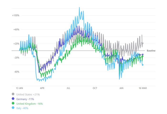 Some indicators of economic activity and mobility are already starting to pick up. The number of commercial flights worldwide has risen to just over 73,000 a day; still down about a third from pre-pandemic levels in 2019, but the highest for about 12 months apart from Christmas week last year. Apple’s mobility tracker, measuring searches for directions, shows activity in the US and Europe well below its peaks during the lull in Covid-19 cases last summer and autumn, but rising in 2021.