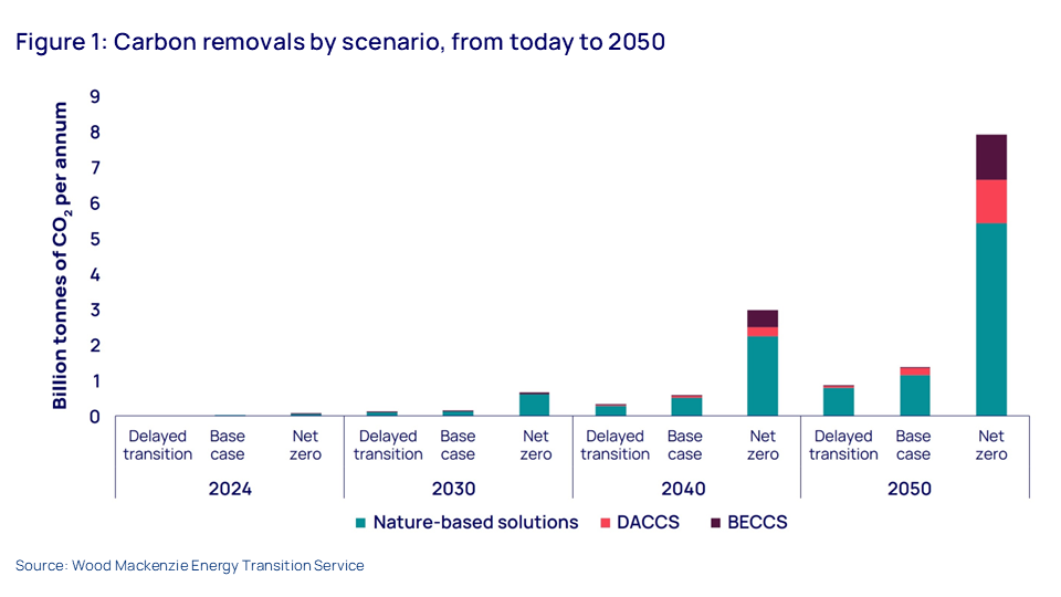 This comes from our latest Horizons report: Carbon removals: the 'net' in net zero. It shows the volumes of carbon removals that we expect in our three key scenarios: our base case forecast, a delayed transition case, and a net zero scenario. It includes the three key routes: nature-based solutions such as reforestation, bioenergy with carbon capture and storage (BECCS) and direct air capture with carbon storage (DACCS). The key point is in the right-hand column in each group: in a credible scenario for net zero emissions by 2050, large volumes of carbon removals will be needed.