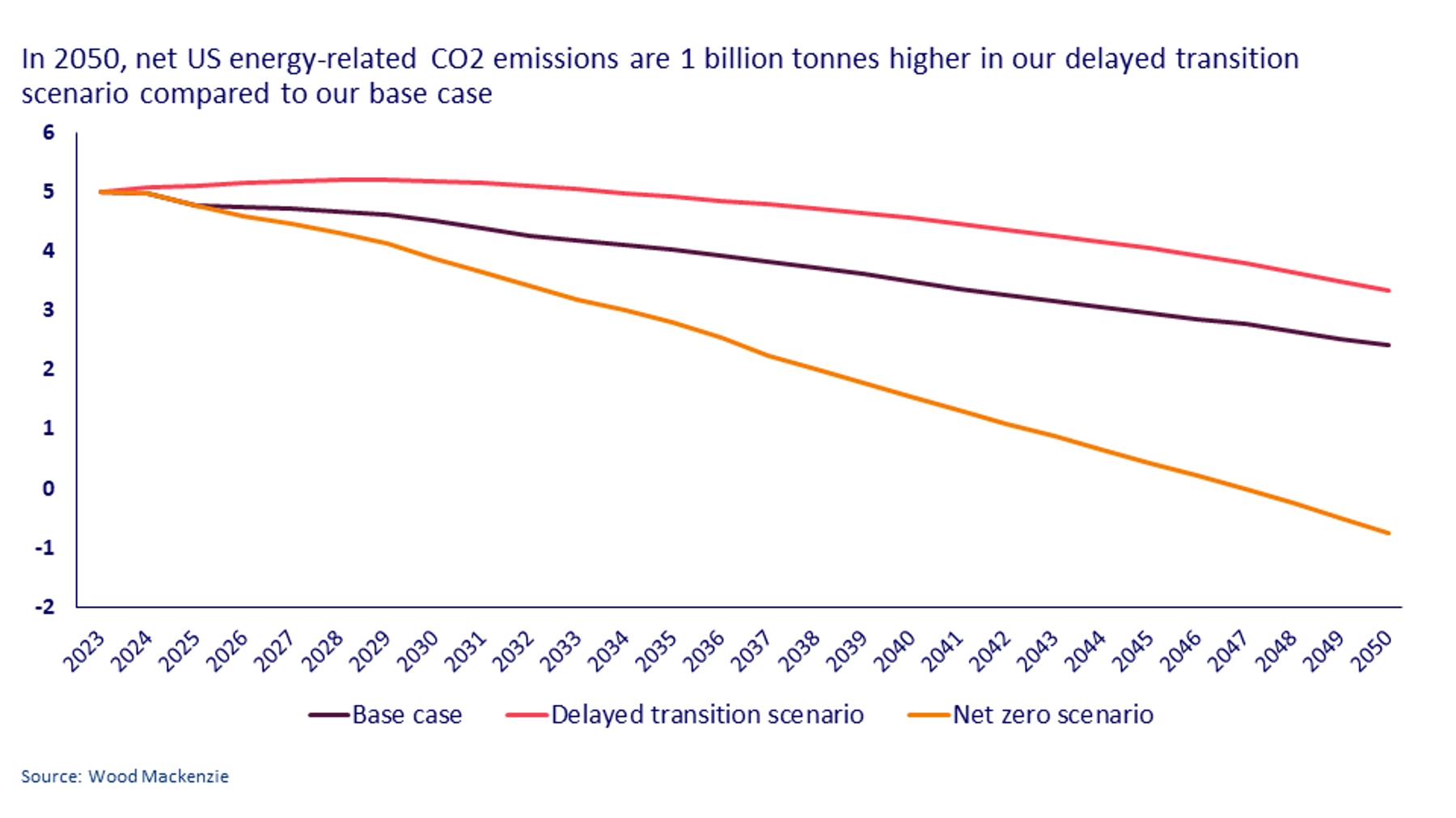 This is a chart from that report, showing a useful metric for summarising the impact – annual energy-related carbon dioxide emissions for the US. You can see that our base case forecast, the purple line, already puts the US way off course for reaching net zero emissions by 2050. The shift in the trajectory that could result from policy changes under a Republican administration and Congress, to what we are calling our delayed energy transition scenario, would move the US even further from that pathway.