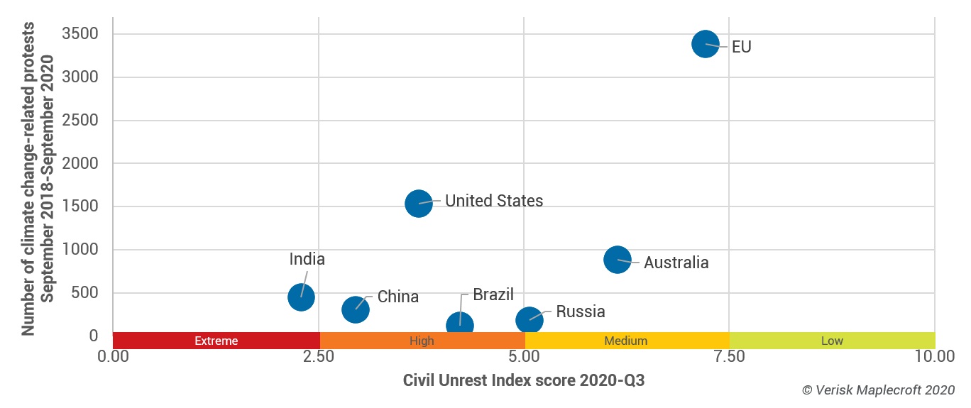 This chart showing the prevalence of climate protests in selected leading economies comes from Franca Wolf of Verisk Maplecroft, an affiliated company of Wood Mackenzie. It shows on the y axis the number of climate-related protests over the past two years, plotted against a civil unrest index score on the x axis, with a higher score indicating less unrest. The key point to notice is that the EU, the US and Australia have had the most climate protests among this group of developed and emerging economies, but that is not simply because they see more demonstrations in general. China and India, for example, are countries that are more exposed to civil unrest, but they have seen relatively few climate protests. The chart illustrates that it is people in richer countries who are generally the most highly motivated to take political action on climate change.