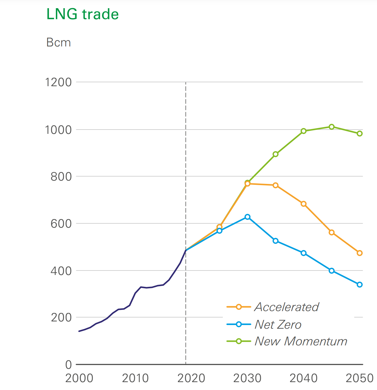 This chart instead shows projections for the global LNG trade. You can see that in that same “New Momentum” scenario, global LNG trade around 2040 is expected to be twice as great as it was in 2020. Even in the “Accelerated” and “Net Zero” scenarios, which are broadly in line with meeting the goals of the Paris Agreement for limiting global warming, there is still growth in LNG trade at least into the 2030s. Even by 2050, the world LNG market might be about the same size as it is today.