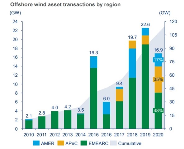 This comes from a new report called 2020 in review – a new baseline for the offshore wind industry, from Søren Lassen, Wood Mackenzie’s head of offshore wind research. It shows the volume of corporate activity for worldwide asset transactions in offshore wind, measured by the gigawatts of capacity involved. You can see the slowdown in 2020, which is more the result of a normal cycle in activity than anything to do with the pandemic. What is particularly interesting, though, is the regional breakdown. In the past, deal-making in offshore wind has been very much a European phenomenon, because that was where the industry was. Last year, however, less than half of the capacity that changed hands was in Europe, and there were significant increases in activity in the Asia-Pacific region and the Americas. Including emerging Europe, 87% of the transaction volume was in emerging markets. With corporate activity typically paving the way for future investment, the data underpin the expectation that offshore wind is set to grow beyond its traditional home territory in north-west Europe. (One footnote: the data excludes China.)