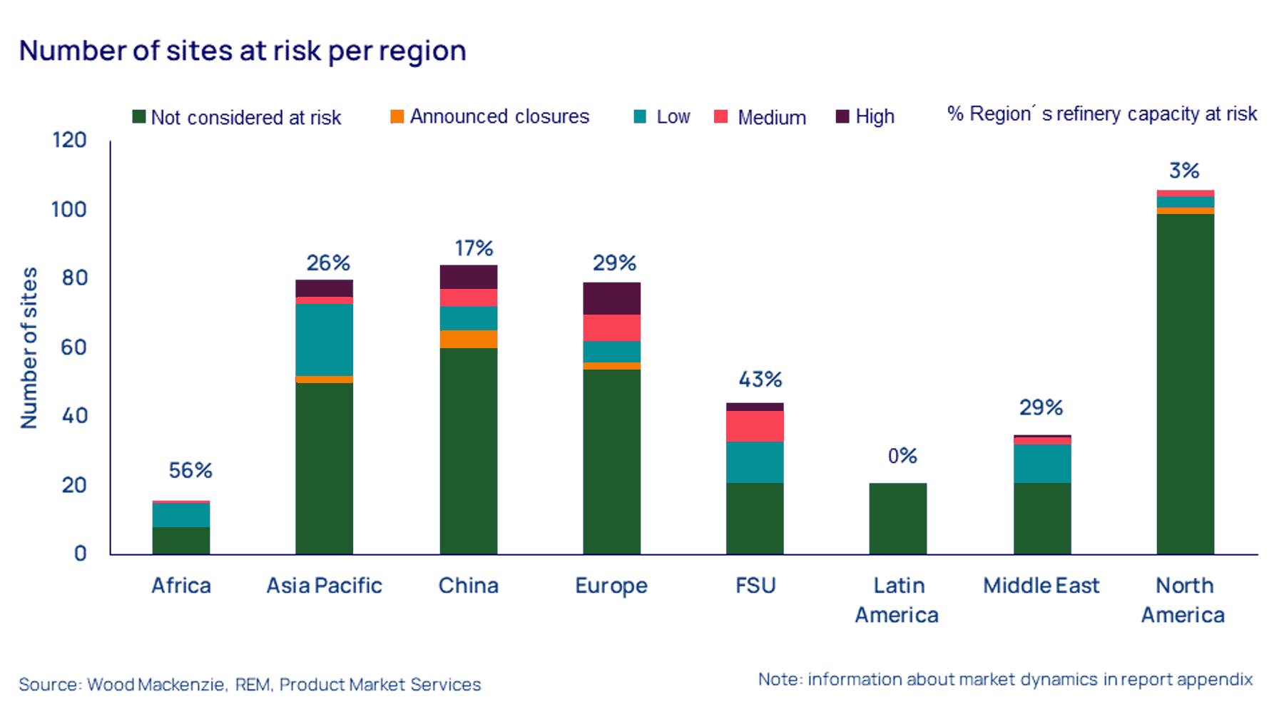 This comes from a new note by Emma Fox, a senior oils and chemicals analyst at Wood Mackenzie, showing our assessment of where refinery sites are at risk of closure around the world. There is a shortlist of 120 out of 465 refining assets in total that we assess as at high, medium, or low risk of closure, based on 2030 net cash margin (NCM) forecasts. As much as 3.6 million barrels a day of refinery capacity worldwide is at high risk of closure, with a further 19.95 million b/d at some risk, our analysts believe. Europe and China, two of the economies that are leading the world in terms of EV adoption, also lead the way in terms of high-risk refining sites. We expect total world refining capacity to increase every year between 2024 and 2026, but after that we expect it to go into decline, as refinery closures outweigh new construction and expansions.