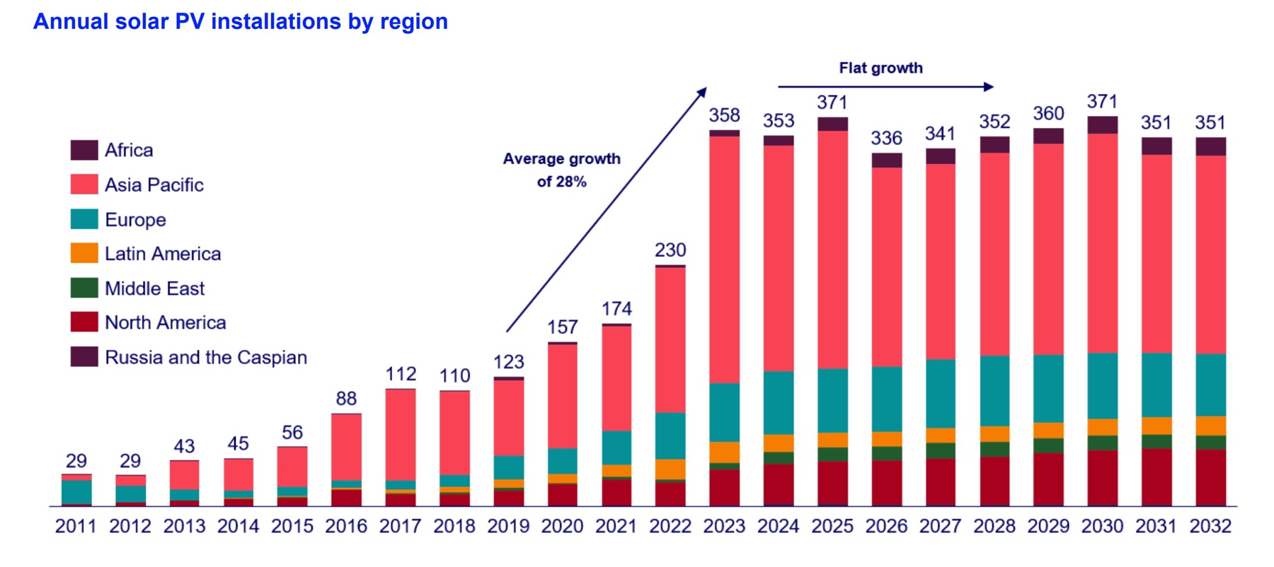 This comes from a new report setting out three big predictions for the solar industry, from our head of global solar Michelle Davis. In the first one, she puts some numbers behind the call that she included in my lookahead to 2024 at the end of last year: starting from 2024, solar will shift from a high growth industry to a slower-growing, mature industry.