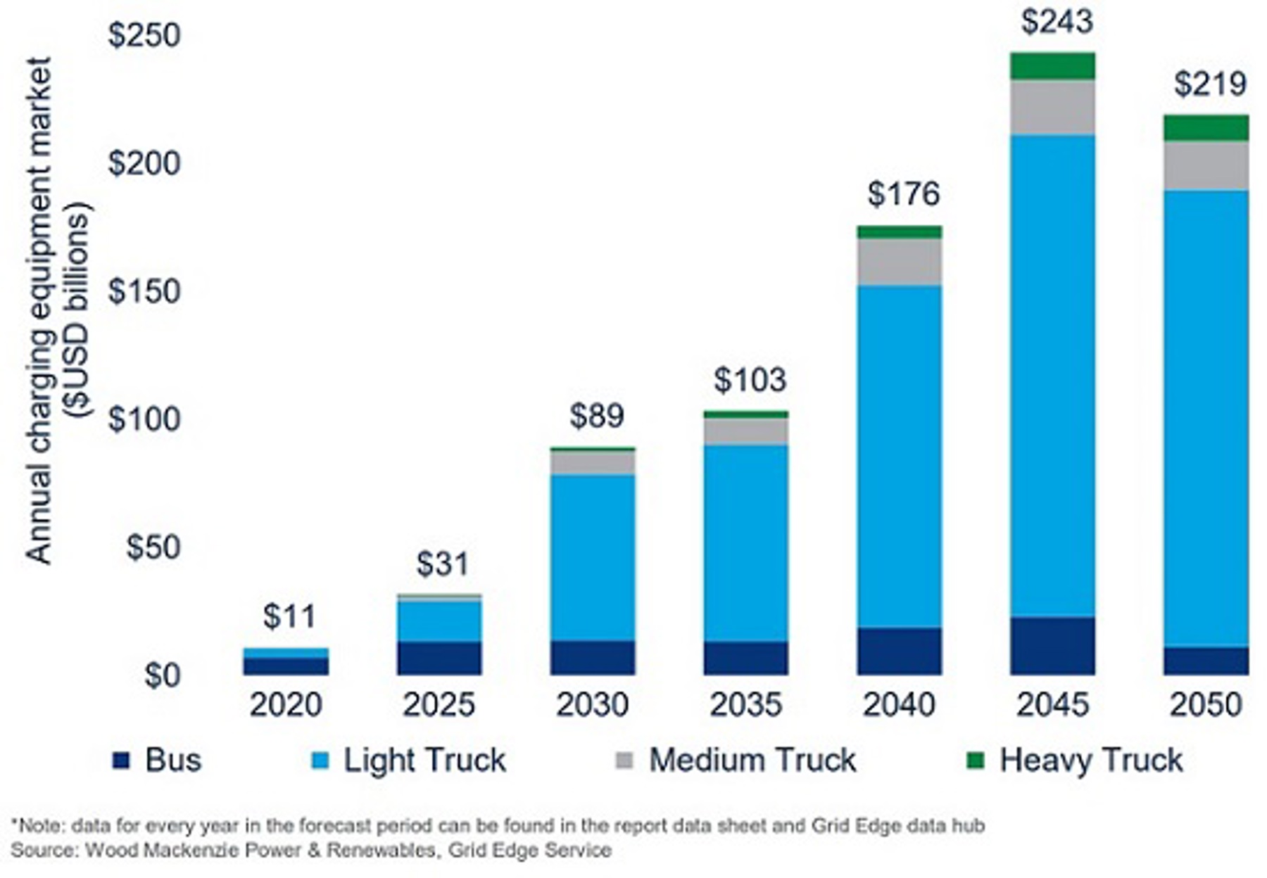 A corollary of the expected boom in EV sales is that there is also going to have to be a boom in charging infrastructure. This chart from Wood Mackenzie’s Kelly McCoy shows the massive growth expected in the market for equipment for charging commercial vehicles. Electric buses and trucks remain relatively expensive compared to their diesel and gasoline-fueled rivals, but governments pushing for reductions in greenhouse gas emissions and local air pollution are expected to drive rapid growth over the coming decades. Last year, most of the spending on charging infrastructure worldwide was for electric buses, where China is dominant, but that is expected to change dramatically over the next few years. Charging equipment for light trucks is forecast to account for the great majority of spending on infrastructure for commercial EVs out to 2050.