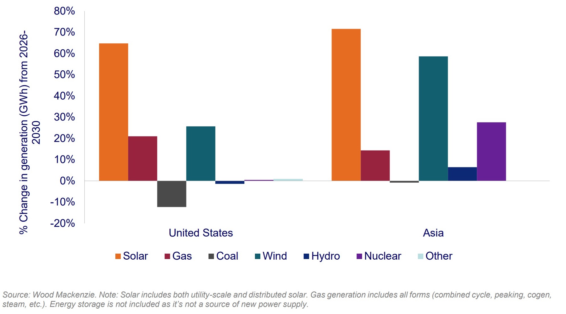 This chart, from Wood Mackenzie’s new note on what to look out for in the global solar industry this year, shows forecast growth rates for generation from different technologies from 2026 to 2030 for the US and Asia. In the US, solar is still a smaller proportion of the total generation mix than fossil fuels, so although it is growing faster than gas, in absolute terms it will not add as much additional power. However, the gap is closing. We are forecasting that annual solar generation in the US will grow by 232 GWh, or 65%, while annual gas-fired generation grows by about 340 GWh, or 21%.