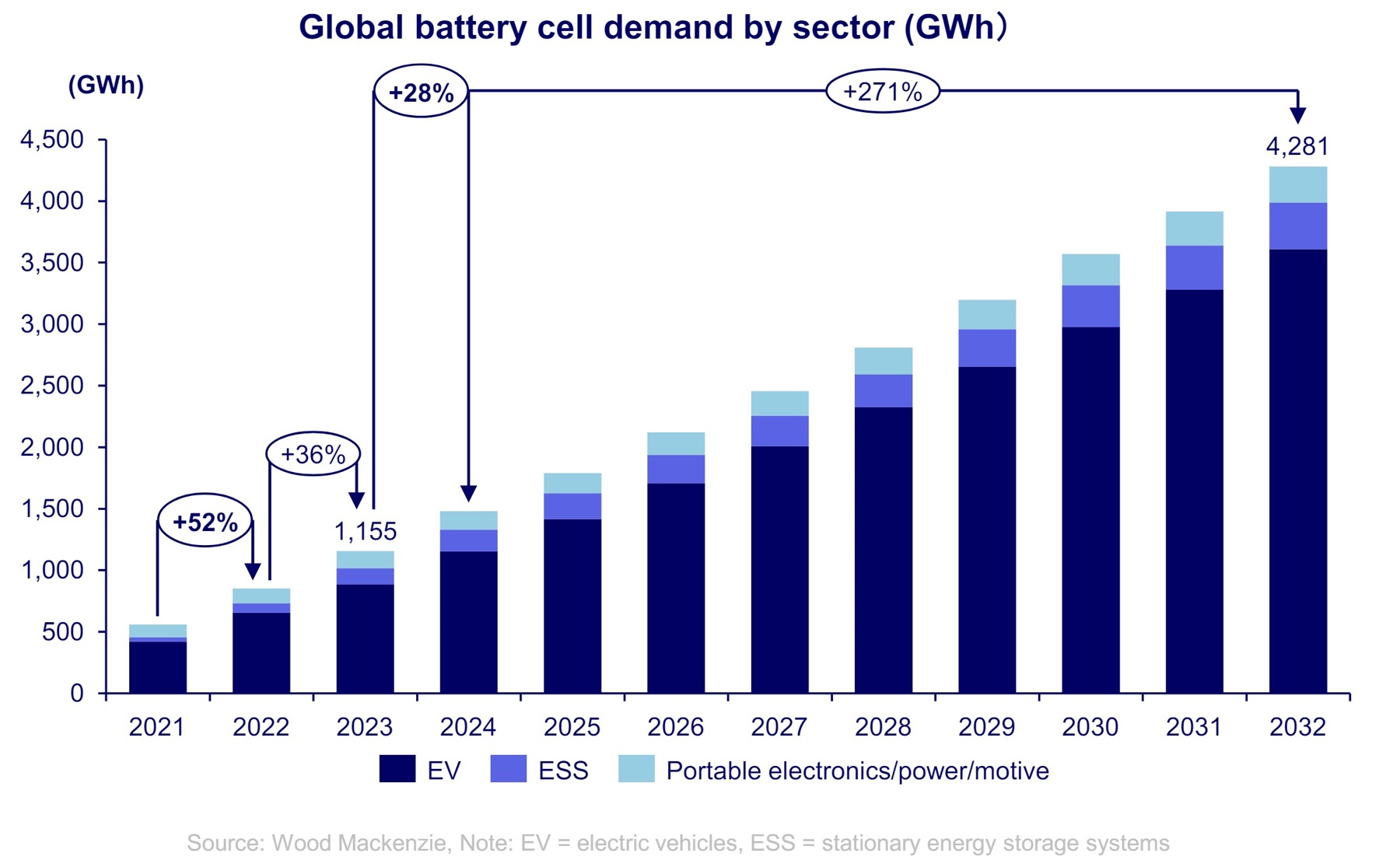 The first is just the spectacular pace of growth that has already been achieved in recent years, and the continued growth that we are forecasting into the 2030s. The second is that demand for electric vehicles absolutely dominates the global battery market, accounting for 77% of cell demand in 2023 and a projected 84% in 2032. Compared to the EV industry, stationary storage and other uses such as electronics are relatively minor segments.
