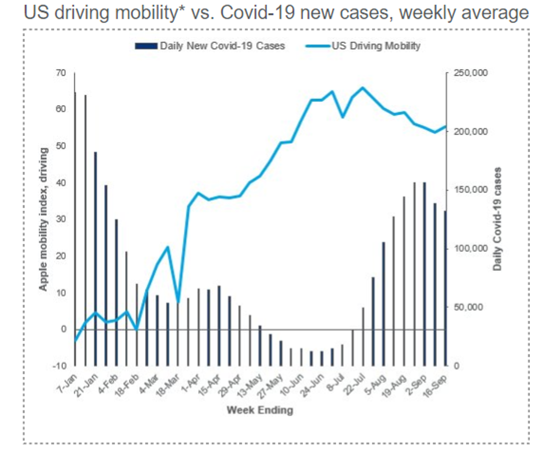 In the US, petroleum product demand over the summer has been approaching its all-time highs at about 21 million b/d. Gasoline consumption since July has been only about 2% below its 2019 level. Mobility data show that even as the Delta variant of Covid-19 caused a surge in US infections, people kept driving. The bars here are daily new Covid-19 cases, the line is Apple’s driving mobility indicator, based on requests for directions on its Maps app.