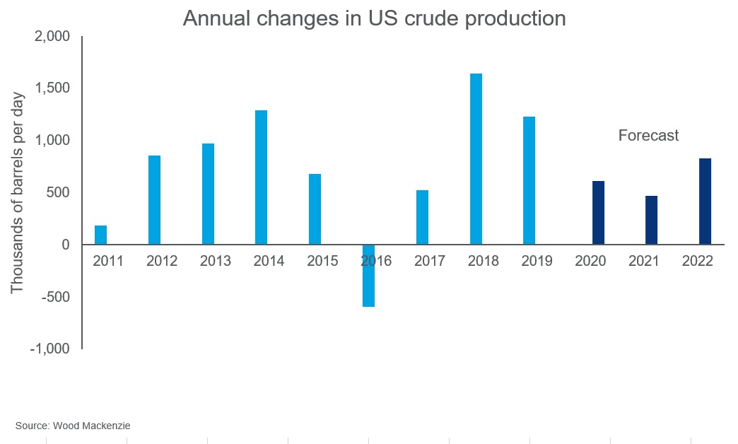 One piece of good news for OPEC recently has been the downward revision in expectations for US oil production over the next couple of years. WoodMac’s latest oil supply outlook, published last week, shows that average US crude output next year is expected to rise by only about 610,000 barrels per day; just half the increase this year of about 1.23 million b/d. As you can see from this chart, the slower growth is expected to persist for the next couple of years.