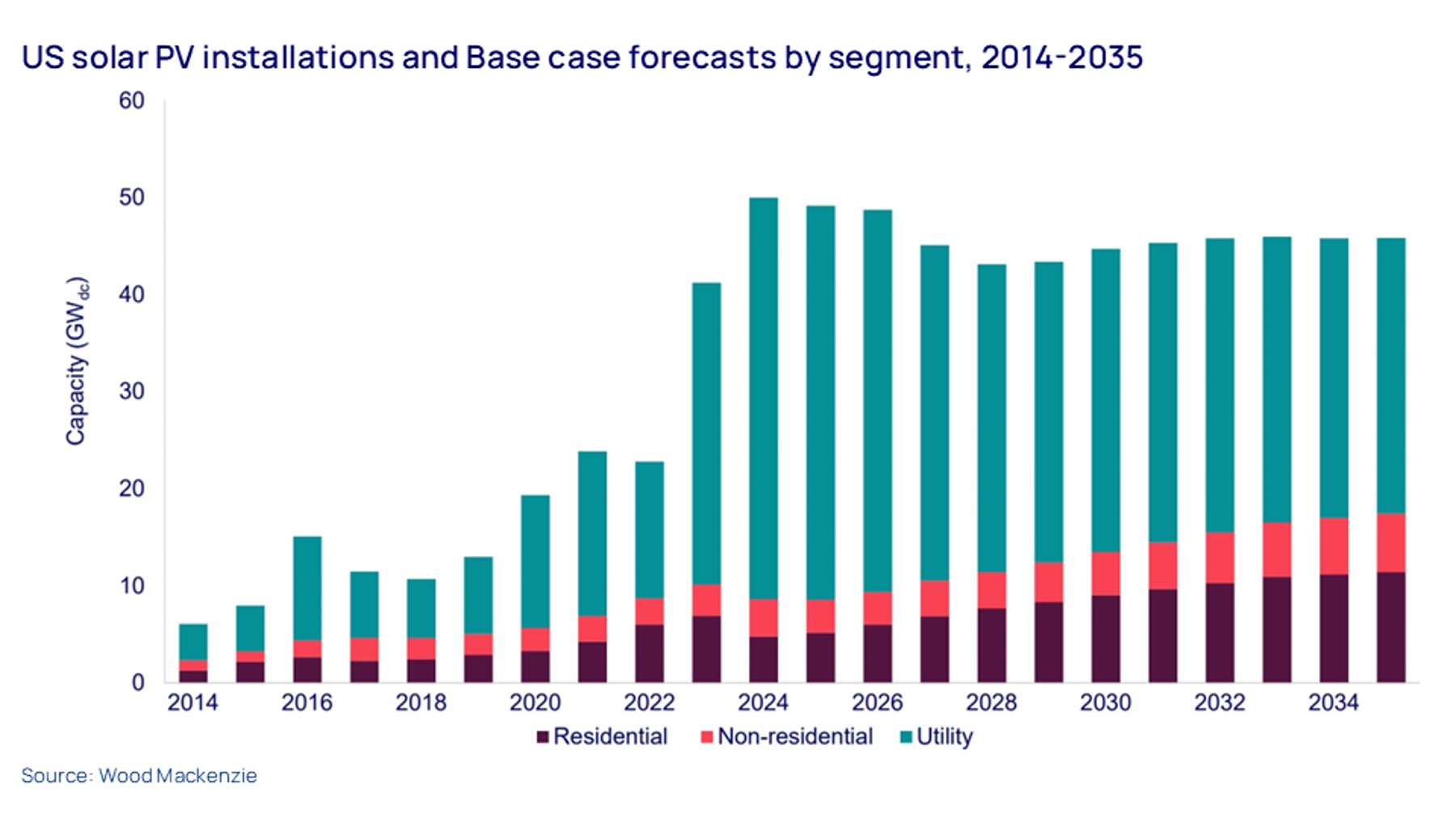 This chart shows US solar photovoltaic installations, actual numbers since 2014 and forecasts out to 2034. It comes from the new US Solar Market Insight 2024 Year in Review report, published by the Solar Energy Industries Association (SEIA) and Wood Mackenzie.