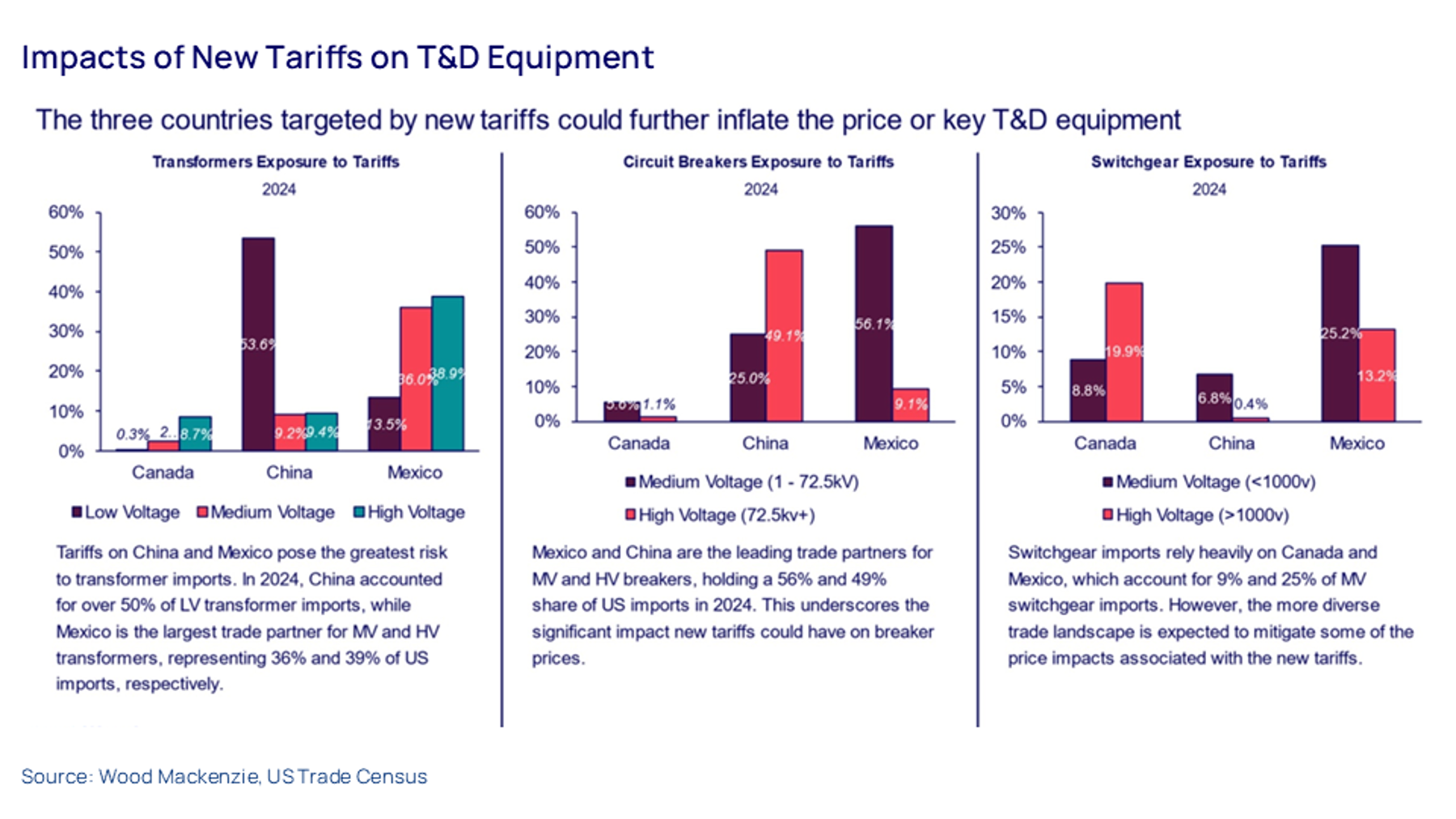 This comes from the Wood Mackenzie analysis of the potential impact of President Trump’s new tariffs that I mentioned above. It shows the shares of US imports of key electrical equipment sourced from Canada, Mexico and China, the three countries most immediately threatened by the new tariffs.
