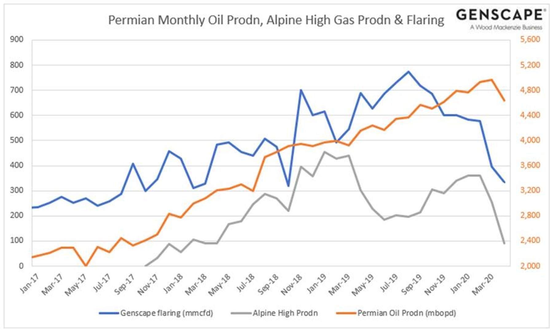 As oil production boomed in the Permian Basin over the past decade, so did the volume of associated gas being burned off in flares. The slowdown in activity this year has meant that flaring has fallen dramatically. This chart, compiled by Randall Collum of Wood Mackenzie’s Genscape service, is based on satellite radiant heat data used to calculate flared volumes. You can see how flaring — the blue line — hit a peak at the end of last summer and has since been on a declining trend. Initially, the crucial factor seems to have been the full startup of the Gulf Coast Express pipeline, which takes gas out of the Permian to the coast. This year, falling output has been driving the reduction. As operators have cut production, first from the Alpine High formation in west Texas and then from the Permian as a whole, they have less need to flare off gas.