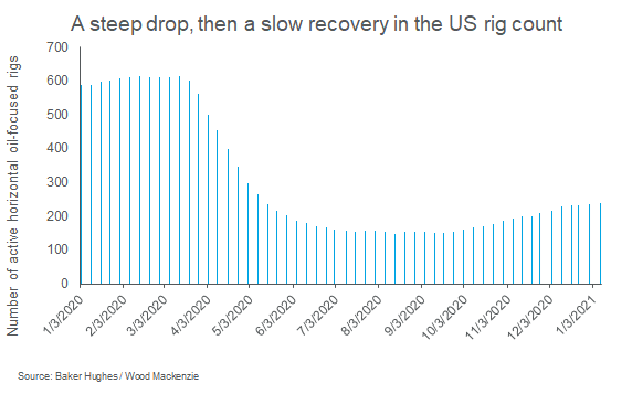 The brakes were slammed on the US oil industry last year as the Covid-19 pandemic hit and crude prices plunged. The number of horizontal oil-focused rigs active in the Lower 48 states dropped from 614 in mid-March to a low of just 147 in August, according to Baker Hughes.