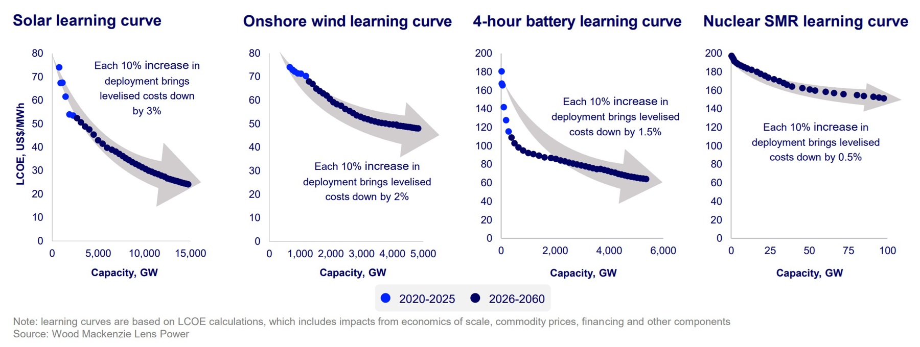 This comes from a presentation given by Xizhou Zhou, Wood Mackenzie’s head of power and renewables, at our inaugural European Power Investment Summit in London earlier this month. It shows the learning curves driving cost reductions, over the past five years and for the next 35 years, for solar, wind, batteries and small modular reactors. Zhou argues that efficiency improvements will continue to drive long-term cost reductions, especially for renewables.