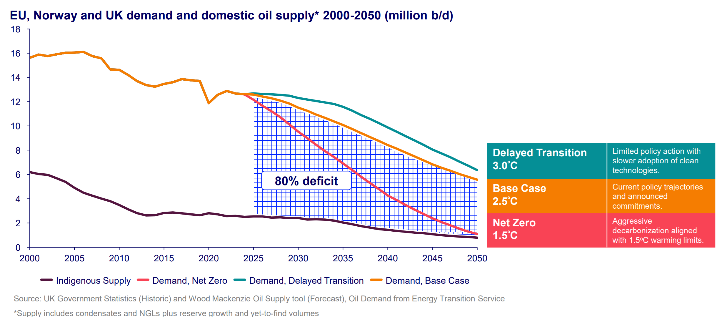 It shows the balance of supply and demand for oil in the EU, UK and Norway, with historical data back to 2000 and Wood Mackenzie forecasts out to 2050. You can see that Europe has been reliant on oil imports for decades, and will remain so for decades to come, unless it moves towards achieving net zero emissions by 2050. As things stand, that looks highly unlikely.