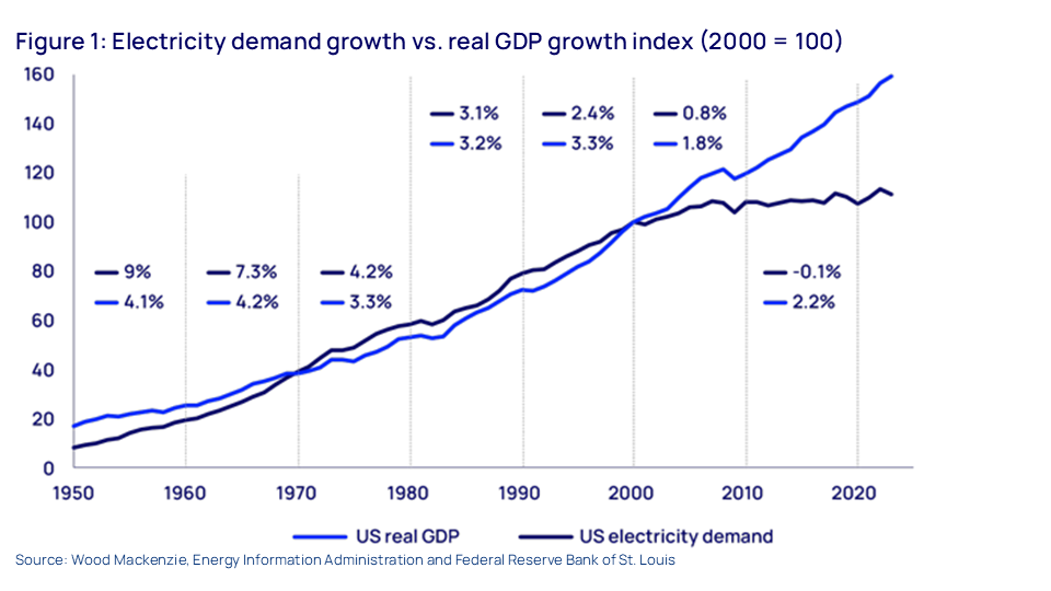 This chart is a history lesson, showing the prevailing trends in electricity demand growth in the US, right up to the point where they are starting to change. It comes from our new Horizons report: Gridlock – the demand dilemma facing the US power industry, written by Chris Seiple, Wood Mackenzie’s vice chairman for the energy transition and power and renewables.