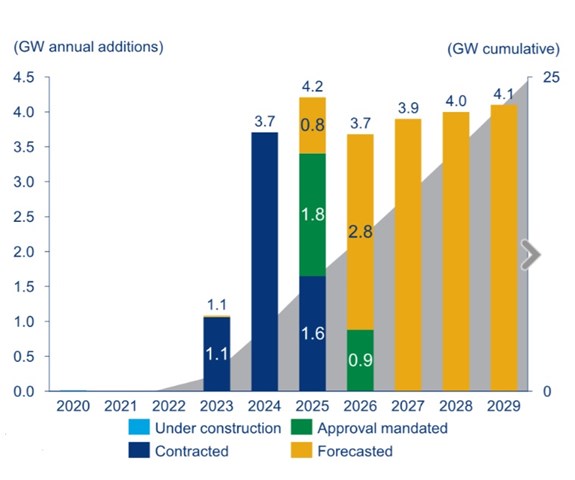 There is strong support from many states along the East Coast, however, and investment in US offshore wind is expected to rise strongly. Projects with about 9 gigawatts of capacity are already contracted or soon to be approved. Wood Mackenzie’s base case forecast is that nearly 25 GW of capacity will be added by the end of 2029. The federal Investment Tax Credit for offshore wind, available for any project that has started construction by the end of this year, requires developers to start generation or within four years or be prepared to prove “continuous efforts”, adding an incentive for them to move as fast as possible.