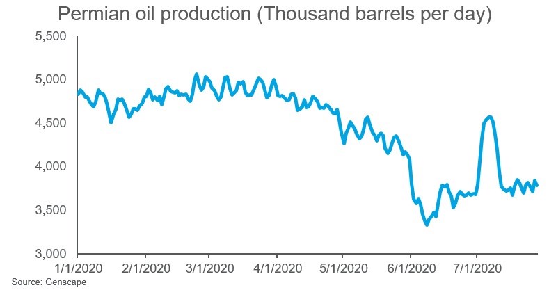 In the Permian Basin, on the other hand, production also started declining in April, but apart from a spike in early July has not really recovered at all. Because production in the Permian is much higher than in the Bakken, it has a greater impact on the national total.
