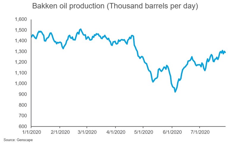 The regional breakdown of production shows some interesting trends that lie behind the national picture. In the Bakken formation, production started to decline in April, but hit a low point in June and has started to recover since then.