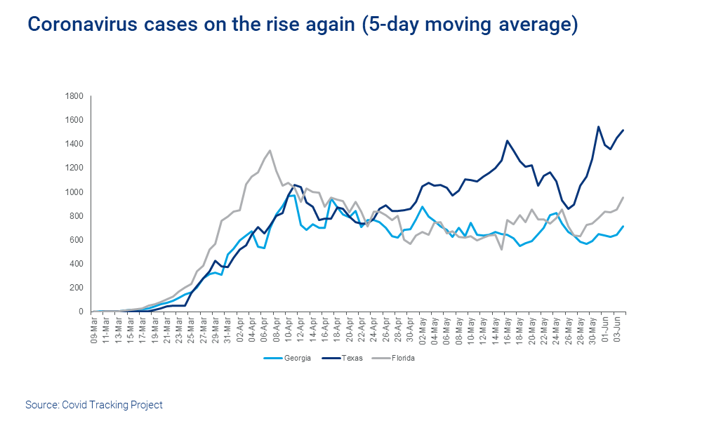 As economic activity recovers, however, there have been some troubling signs of a pick-up in coronavirus cases in some states. Texas reported 1,949 new cases on Sunday, a record high for the state, and the trend has been rising. Florida similarly reported a record number of new cases on Thursday.