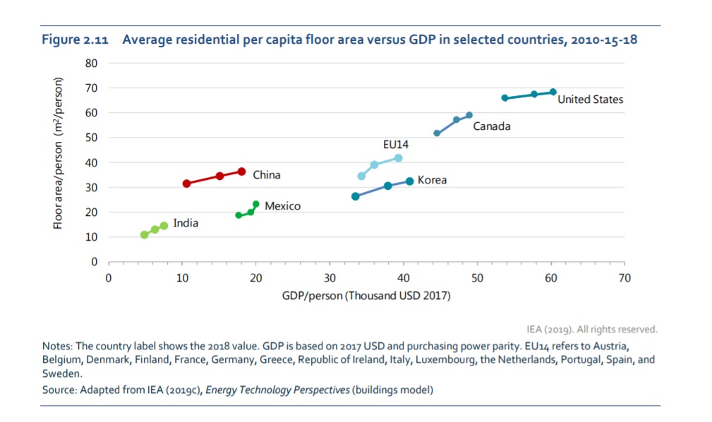 This comes from the IEA’s Energy Efficiency 2019 report, published this week. The report sounded the alarm about a slowdown in the pace of improvement in efficiency, which the IEA blames on some short-term factors, including the weather and a cyclical upturn in energy-intensive industries, and some long-term factors including the tendency for people to live in larger homes. From this chart, the correlation seems pretty clear: the richer people are, the more living space they want, wherever they are in the world.