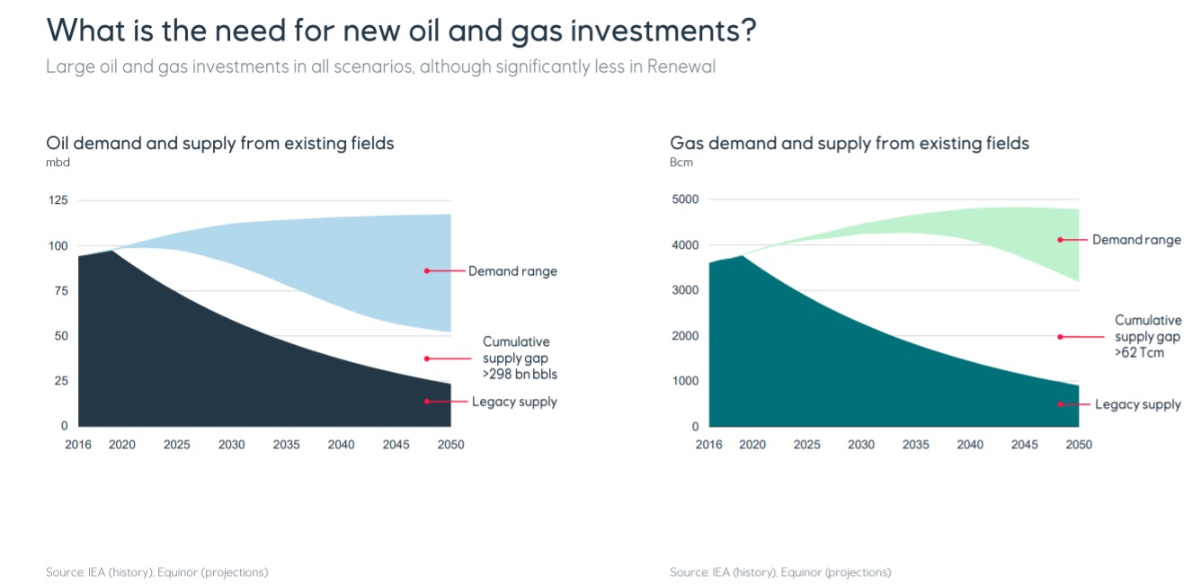 Just because the world is not presently on course for the Renewal scenario, that does not mean it cannot happen. Government policies can change quickly if a crisis becomes unignorable, and a sharp increase in the damage being done by climate change could sweep away political opposition. Equinor wants to be positioned to be ready in case such a rapid shift starts to gather momentum. And conversely, even in a world in which governments do make a serious effort to limit the rise in global temperatures, Equinor still thinks there will be a need for investment in new oil and gas production. Standard production decline rates suggest that by 2050 a wide gap will open up between output from existing oil and gas fields and demand, even at the reduced levels implied by the Renewal scenario.