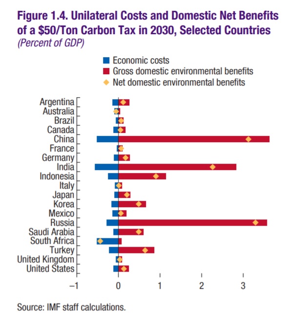 The column drew on a fascinating IMF report on the case for using carbon taxes and similar policies to help reduce the risk of climate change. The 96-page report, called a Fiscal Monitor, is well worth a look, and is full of interesting charts. This one in particular caught my eye, showing how a carbon tax could have very substantial net benefits for China, India and Russia – even ignoring its effects on climate change – because by encouraging their economies to shift away from coal it would improve air quality and reduce lung disease.