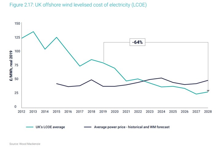 This comes from the fascinating recent study, Closing the Gap: Technology for a Net Zero North Sea, which was written by Wood Mackenzie for the Oil & Gas Technology Centre. It shows how the plunging levelised cost of electricity from offshore wind, the blue-green line, will soon bring it below average UK power prices. Over the next 15 years, investment in offshore wind in the UK Continental Shelf is expected to be as great as investment in oil and gas.