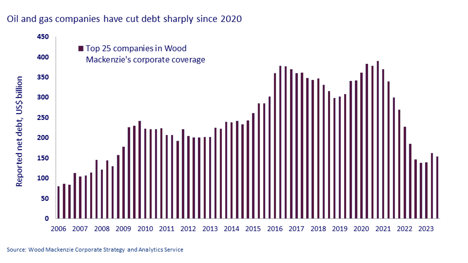 This time, the chart highlights the position of another energy sector: oil and gas. Since the pandemic, the world’s leading oil and gas companies have worked to reduce their debt burdens, helped by relatively high commodity prices. Today, their debts in absolute terms are back to levels last seen in 2009, and less than half their recent peak in 2020.