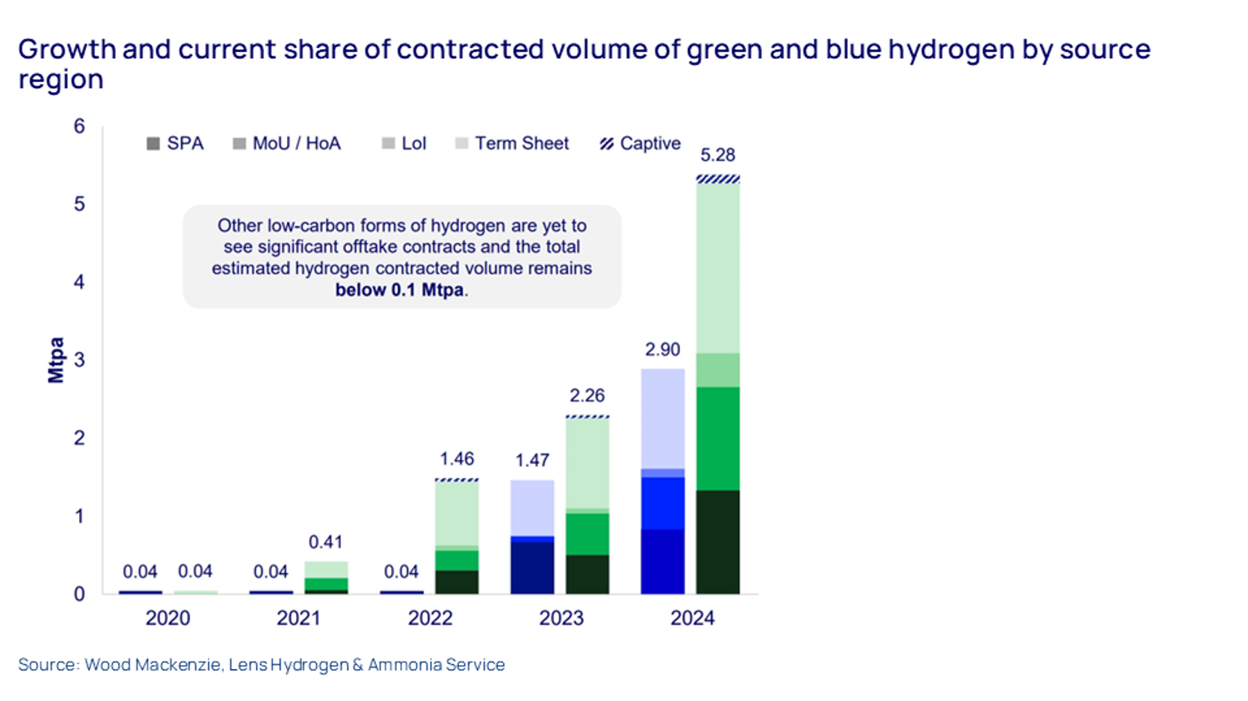 This comes from a new note by Murray Douglas, Wood Mackenzie’s Vice President for Hydrogen and Ammonia Research. It shows contracted volumes of low carbon hydrogen: blue made from natural gas with carbon capture, and green made by electrolysing water. You can see that although a range of different agreements have been signed, the firm commitments under sales and purchase agreements (SPAs), shown by the darkest sections at the bottom of the bars, only cover a minority of the deals.
