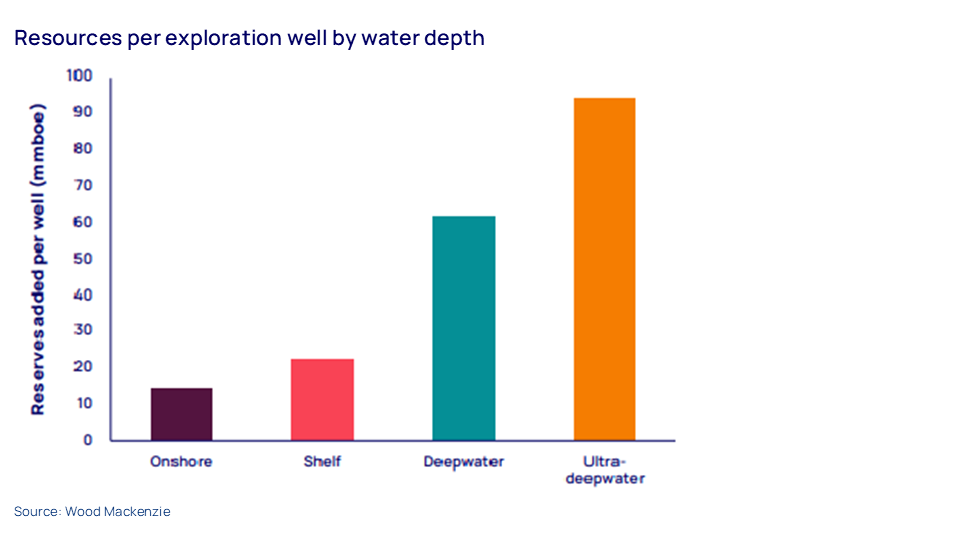 You can see that deepwater is well ahead of any other theme, in terms of the size of the discoveries that have been made. Latham and Bandal say that since 2000, important new geological plays have typically emerged every 18 months, and an overwhelming majority of these “needle-moving” discoveries have been in deepwater environments. Even now, after three decades of such exploration, most of the world’s deepwater basins are barely drilled. Take a look at the full paper for our analysis of what that means for the future of oil and gas exploration.