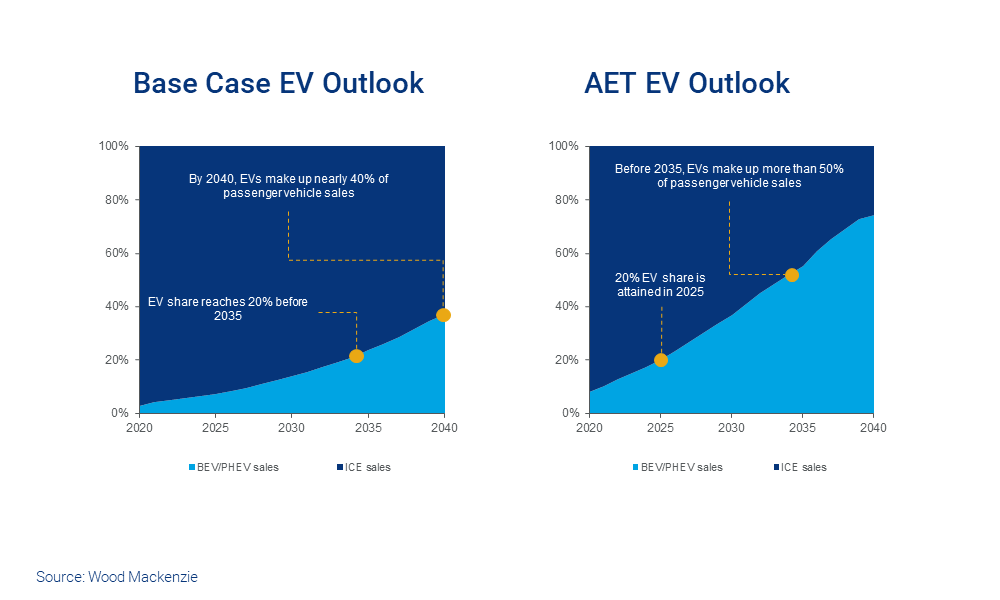 This comes from a recent opinion column by Wood Mackenzie’s Gavin Montgomery and Milan Thakore. The share of electric vehicles in total passenger vehicle sales is expected to grow strongly, even in Wood Mackenzie’s base case forecast, shown on the left.