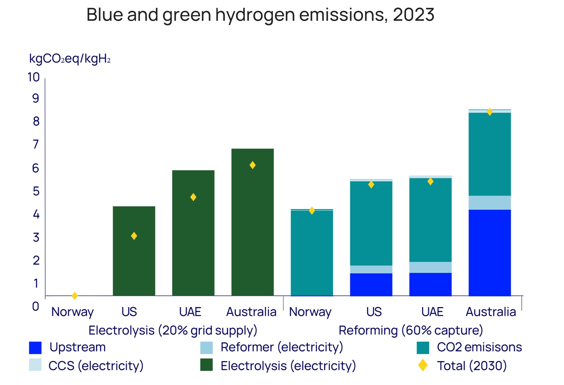 The chart makes her point perfectly. It is often assumed that green hydrogen will necessarily have lower associated emissions than blue, but that is not always the case. Projects that ostensibly produce green or blue hydrogen can have widely varying emissions, depending on factors including the plant’s location, the precise sources of the power it uses, and the proportion of carbon dioxide emissions that are captured. At some times and in some places, associated emissions for some green hydrogen sources can be higher than for some blue hydrogen sources.