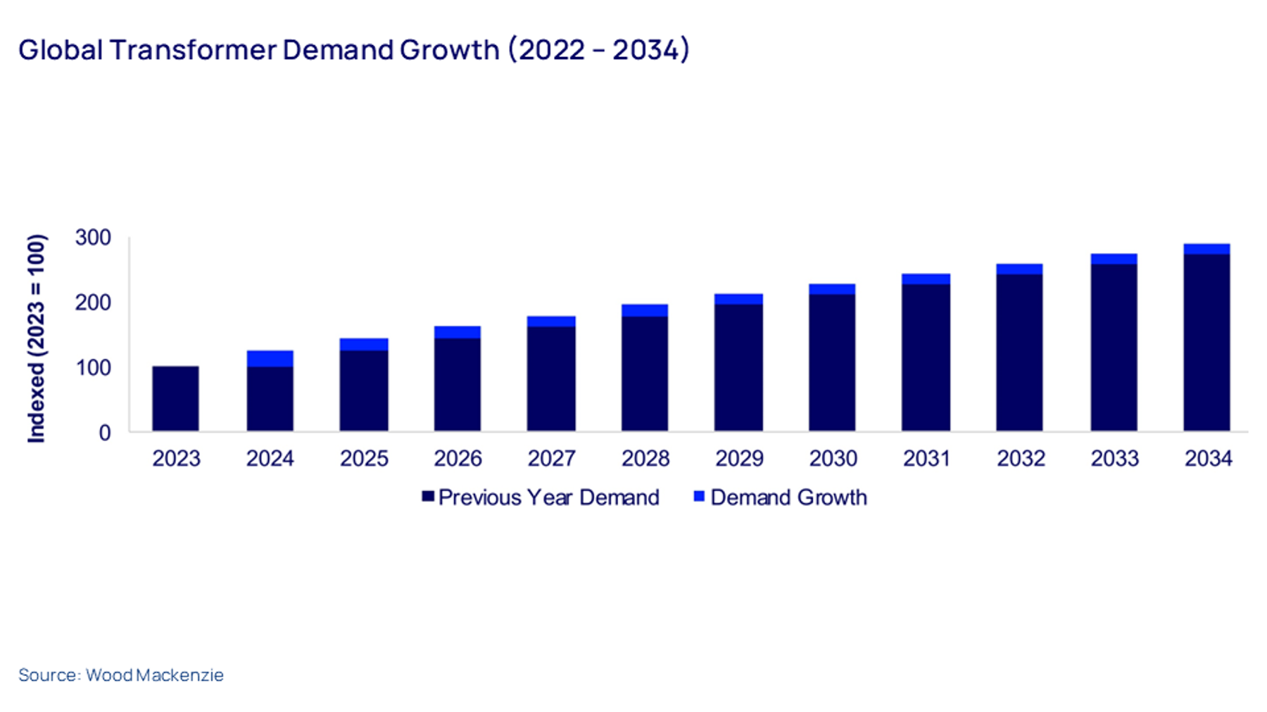 This comes from the slide deck for Wood Mackenzie’s latest study of the supply chain in the power and renewables industry: Making the connection: meeting the electric T&D supply chain challenge. It shows expected growth in worldwide demand for transformers out to 2034. Transformers are essential for the operation of the power grid, and demand is growing strongly, creating strains in the supply chain. Prices are rising and buyers are being forced to wait for product to be available. We project that global sales of transformers will approximately double by the end of the decade.