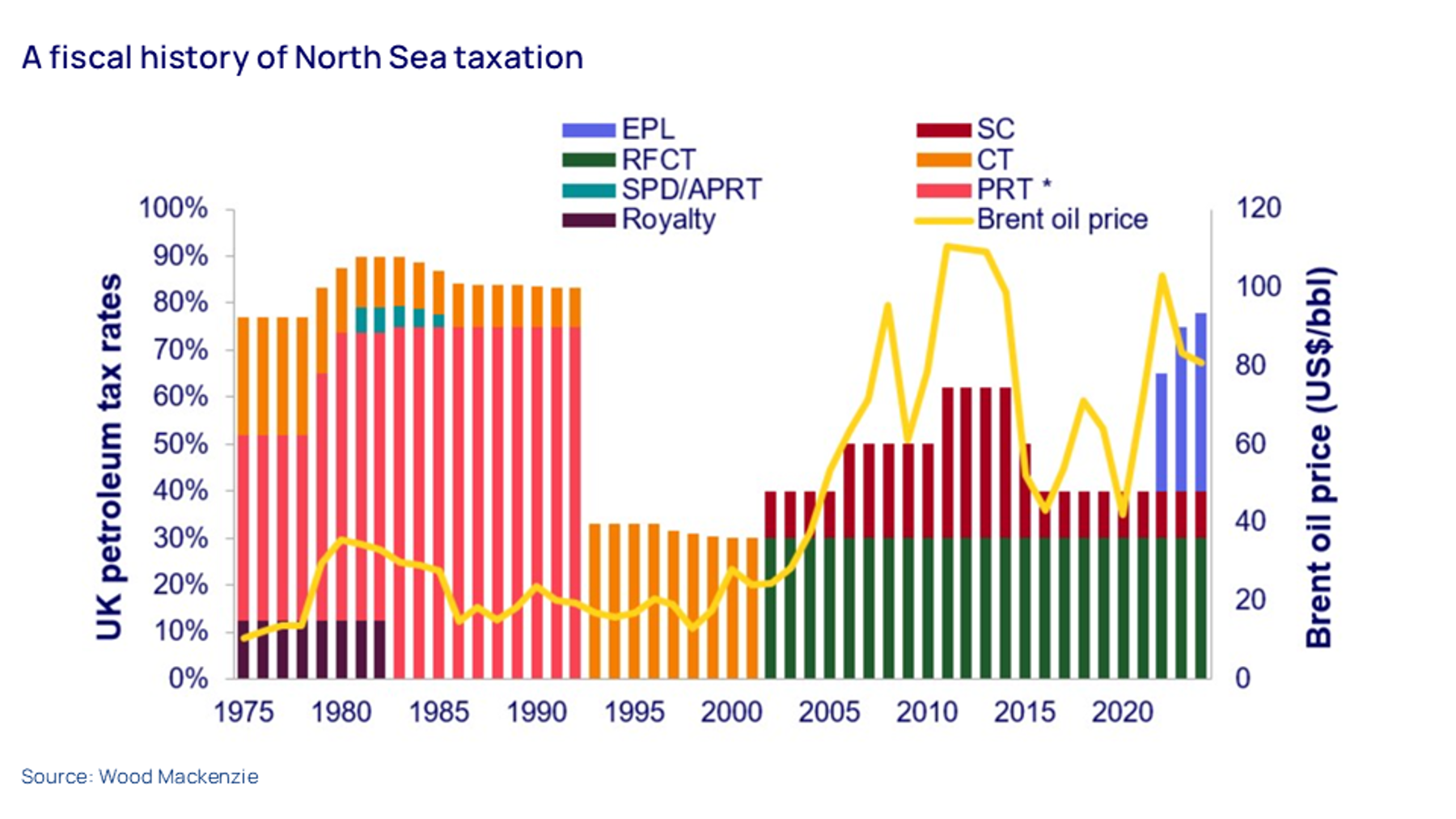 This gives an at-a-glance overview of UK petroleum taxation since 1975. It comes from a recent post by Graham Kellas, Wood Mackenzie’s senior vice president for global fiscal research, warning that the UK North Sea’s future as an oil and gas producing region “hangs in the balance”. You can see that the total effective rate of tax, including the Energy Profits Levy that began in 2022, has risen to its highest since the early 1990s. in a new report, Wood Mackenzie’s Kellas says recent and proposed modifications to the Energy Profits Levy – currently set to end in 2030 – have created “unparalleled sector uncertainty and consternation.”