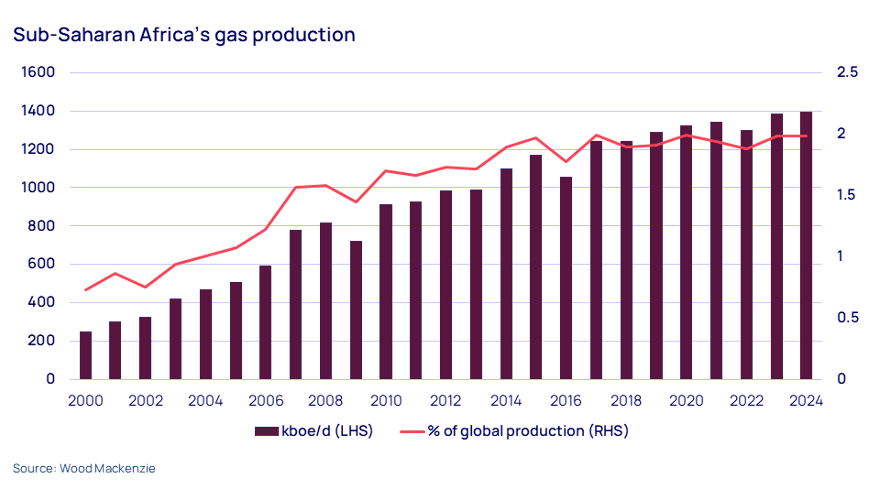 This is a version of a chart from our most recent Horizons report: ‘Asset rich, energy poor: maximising Africa’s natural resources to transform the continent’. It shows the natural gas production of sub-Saharan Africa, as shown on Wood Mackenzie’s Lens Upstream platform, both in absolute terms and as a percentage of global output.