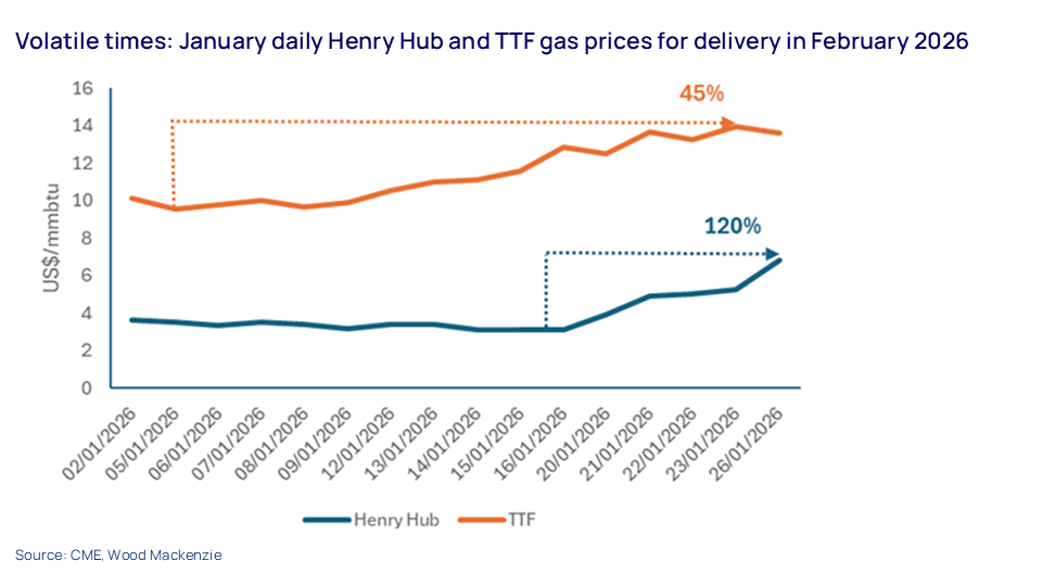Freezing winter temperatures across the northern hemisphere have helped push global gas prices significantly higher. Europe’s TTF forward for February delivery has shot up by over 40% since the start of the month. In the US, Henry Hub prices have more than doubled since 19 January as an ‘Arctic siege’ swept across more than 20 US states. This led to a record freeze-off in gas production just as demand soared.