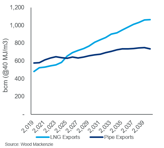 LNG is surfing that wave. The LNG market will more than double in size to over 1000 bcm by 2040, a growth rate eclipsed only by renewables. A niche market not long ago, shipped LNG volumes will exceed global pipeline exports within six years.