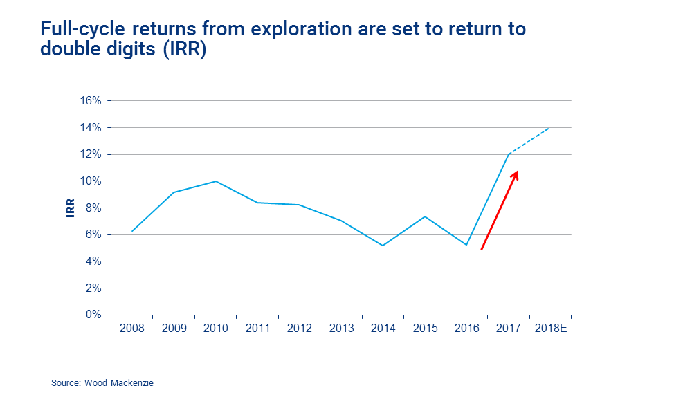 The recent spate of sizeable discoveries also adds to our belief that returns are bouncing back up to respectability. Our preliminary analysis suggests that global exploration generated double-digit returns and created US$5 billion of value in 2017.