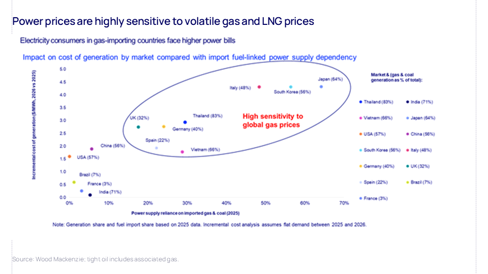 View Allen Wang's full profileThe disruption of oil and LNG supply from the Gulf due to the Middle East conflict has major implications for power markets. Gas and power prices are intrinsically connected – in many markets, gas-fired power generation sets the wholesale price much of the time. When gas prices shift up or down, wholesale power prices typically follow. The current crisis is just the latest to drive up consumers’ electricity bills in markets linked to global gas prices and depress economic growth.