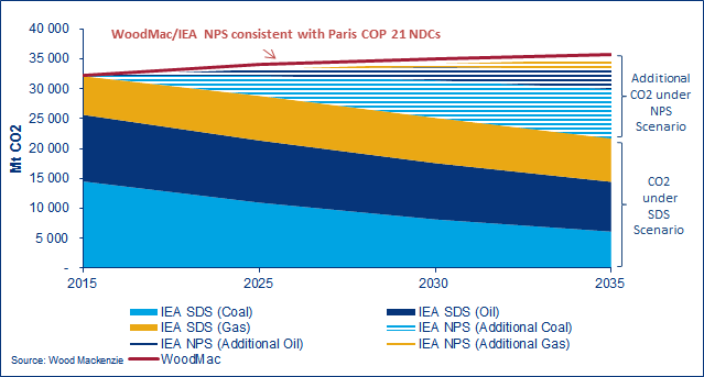 The consumption side is slower, awaiting technological breakthrough. The lower battery costs needed for electric vehicles (EVs) to compete head on and displace ICE cars are some years away. These forces only start to have a significant impact on global carbon intensity in the 2030s. Our forecasts fall well short of the 2°C target, as does the IEA’s base case scenario (see chart).