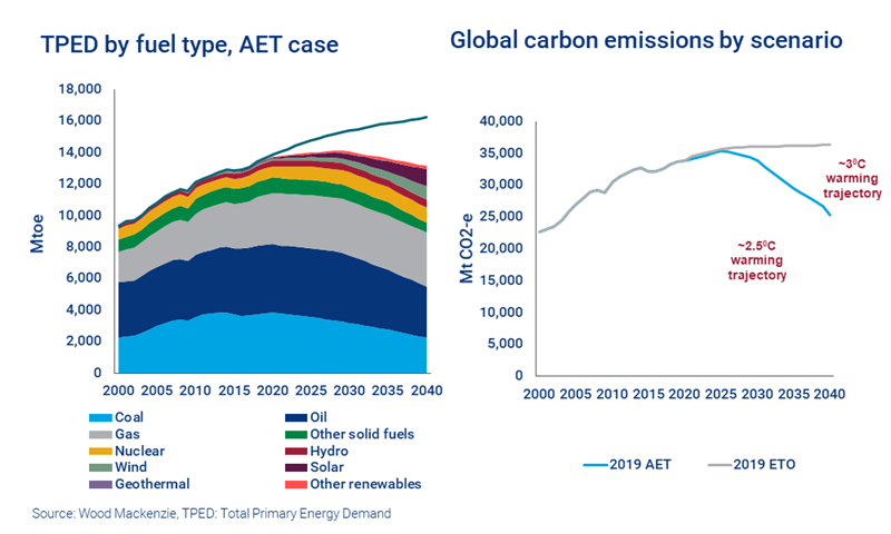 Pretty big. In the ETO, global energy demand continues to grow through the forecast period to 16 Bt in 2040. In the AET, it peaks in 2029 at just under 14 Bt and by 2040 is 20% lower than today.