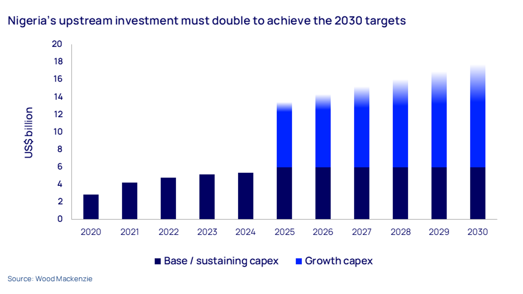 Investment has suffered a steep fall from a peak of US$29 billion (real) in 2014 to just over US$5 billion in 2024. We believe the latter is the absolute minimum required merely to sustain current levels of production. But to achieve the president’s targets, spend needs to more than double to US$12 billion a year immediately and continue growing for the rest of the decade.