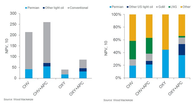 The Permian is central to both bids for Anadarko. But for Occidental, it’s really all about the Permian, which would double its exposure in NPV terms. Anadarko’s conventional assets, about one-third of the total valuation, could all be sold pronto. For Chevron, the fit is broader. Anadarko bolsters its leading Permian exposure; ditto deepwater Gulf of Mexico, while Mozambique injects a sizeable (and needed) growth engine to its LNG portfolio.